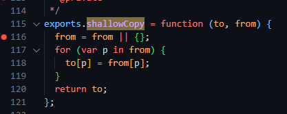 우선, `utils.shallowCopy()` 함수를 보면 다음과 같습니다. 두번째 인자의 값을 첫번째 인자에 복사한 뒤 리턴합니다. 이때 중요한 점은 첫번째 인자가 `opts` 라는 점 입니다. 이 내용을 잘 기억해 주세요.