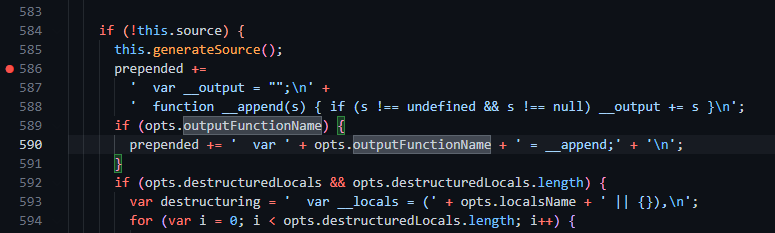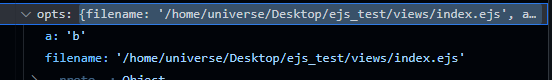 디버깅을 통해 확인하면 `ejs.js:475` 번째 줄의 `utils.shallowCopy()` 함수가 실행됩니다. 이 함수가 실행되면 최종적으로 `opts` 변수에 `a: b` 라는 key, value 가 추가된 것을 볼 수 있습니다.