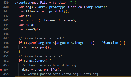 index.js 파일에서 9번째 줄에, `req.query` 변수를 인자로 전달하고 있습니다. express 모듈에서 로직을 처리한 뒤, `ejs.js:454` 줄에서 `args.shift()` 를 통해 data 변수에 저장됩니다.