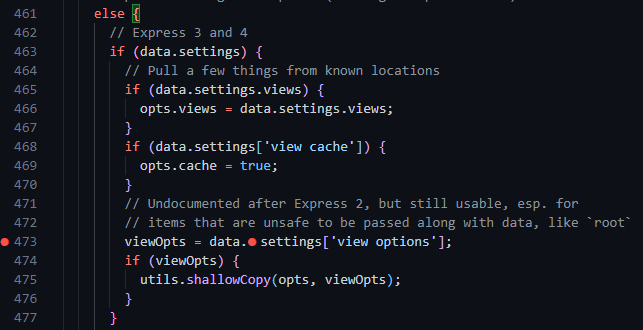 이후 `ejs.js:473` 줄에서 아까 설명한 `data` 변수에서 `data.settings['view options']` 라는 값이 있으면 `475번째 줄` 에 있는 `utils.shallowCopy` 라는 함수가 동작하게 됩니다. 현재 상황에서는 위 사진을 보면 알 수 있듯이 `data` 변수에 `view options` 라는 key가 없습니다. 따라서 `475번째 줄` 코드가 실행되지 않습니다.