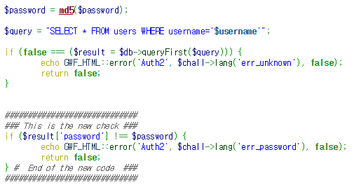 username에 md5를 쓴 이유는 문제의 소스코드에서 post 방식으로 password 값에 md5 결과 값과 DB에 있는 유저의 패스워드와 비교하는 것을 알 수 있다. 따라서 2 라는 계정을 만들때 username 쿼리에 md5 함수로 1을 해시하고 password에 1이라는 값을 넣게 되면 True 이므로 로그인이 성공하게 된다.
