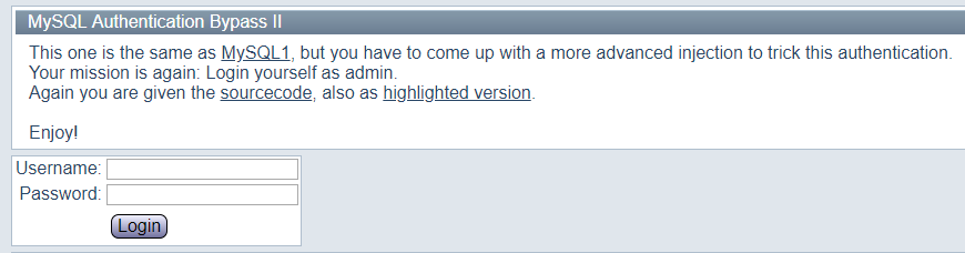MySQL Authentication Bypass II This one is the same as MySQL1, but you have to come up with a more advanced injection to trick this authentication. Your mission is again: Login yourself as admin. Again you are given the sourcecode, also as highlighted vers