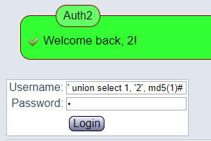 username에 md5를 쓴 이유는 문제의 소스코드에서 post 방식으로 password 값에 md5 결과 값과 DB에 있는 유저의 패스워드와 비교하는 것을 알 수 있다. 따라서 2 라는 계정을 만들때 username 쿼리에 md5 함수로 1을 해시하고 password에 1이라는 값을 넣게 되면 True 이므로 로그인이 성공하게 된다.