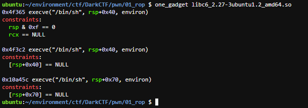 libc database 사이트에서 다운받은 파일로 `one_gadget` 툴을 사용하여 `oneshot gadget offset`을 획득한다.