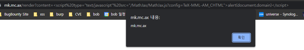 그렇다면, 해당 js 파일을 로드하고 `script` 태그 안에 javascript 코드를 작성하면 CSP에서는 MathJax 파일 안에서 javascript 코드를 실행한 것으로 간주해서 CSP를 우회할 수 있지 않을까라고 생각 했습니다.