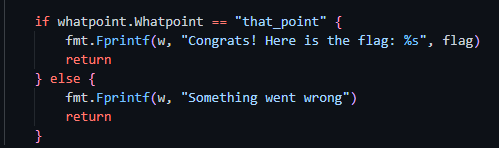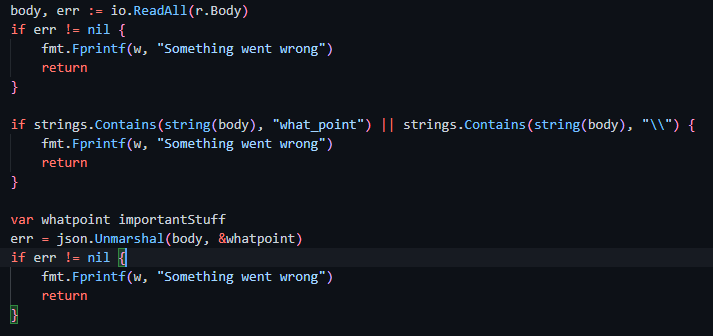 POST 방식으로 전송하면, body에 특정 문자열이 있는지를 검증하고 있습니다. 아래 코드에서는 2번째 if 문에서 `what_point` 와 `\` 를 필터링 하고 있네요. 이후, `json.Unmarshal()` 함수를 통해 body 값을 json parsing 하고 있습니다.