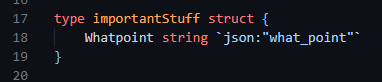 json paring 결과는 `whatpoint` 변수에 저장되는데, 이 변수는 `importantStuff` 라는 구조체 변수입니다.