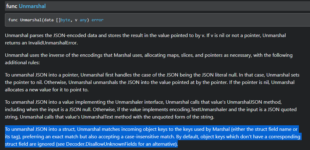 여기서 짚고 가야할 부분은 `json.Unmarshal()` 함수 입니다. 이 함수의 DOCS를 보면 다음과 같이 설명되어 있습니다.