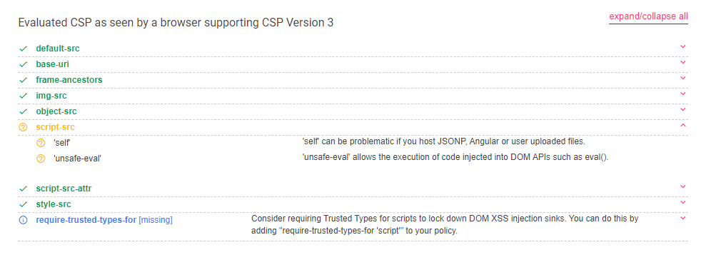 Google CSP evaluator 에서는 script-src에서 보안 결함이 있다고 알려주고 있습니다.