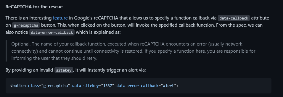 우선 로컬에서 테스트를 하면서 CSP 우회를 시도했습니다. 처음에는 Google recaptcha를 이용한 CSP 우회 방법인 줄 알았습니다. 그래서 찾아본 결과 Google recaptcha를 통한 CSP 우회 기법들이 존재 했습니다.