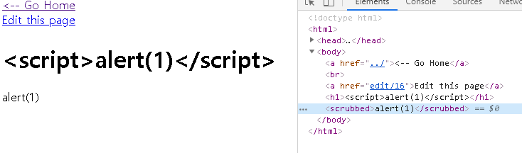 내용 부분에서는 script 태그가 다른 것으로 대체 되었다. 제목은 그대로 들어 갔지만 동작은 하지 않는다.