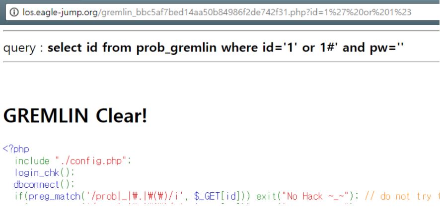 풀이. 쿼리를 넣을 때 가장 중요하게 봐야 하는건 싱글쿼터 일 것이다. 이 문제는 싱글 쿼터를 필터링 하지 않으므로 쉽게 풀수 있다. $result[‘id’]에 어떠한 값이 존재하면 solve() 라는 함수를 호출하기 때문에 아래 처럼 GET 으로 넘겨준다. ?id=1′ or 1%23 여기서 #을 그대로 적지 않고 url encoding 값인 %23을 적은 이유는 브라우저에서 #을 문자열의 끝으로 인식하기 때문에 제대로된 값이 전달되지 않는다. 따라서 GET으로 #을 넘기기 위해서는 %23을 넘겨 주어야 한다.