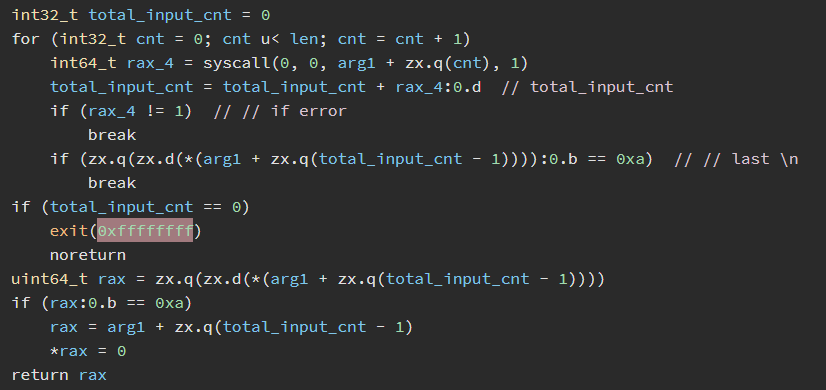 아래 readn() 함수의 일부분을 보면 사용자가 입력한 마지막 값이 0xa 이면 rax에는 주소 값이 들어간다.