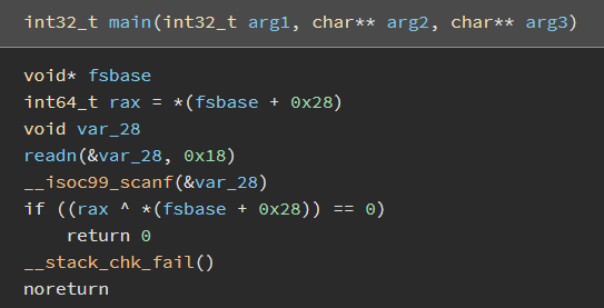 첫 readn() 함수를 호출할 때, 0x18 만큼 입력할 수 있으므로 overflow를 일으키기에는 입력 길이가 작다.