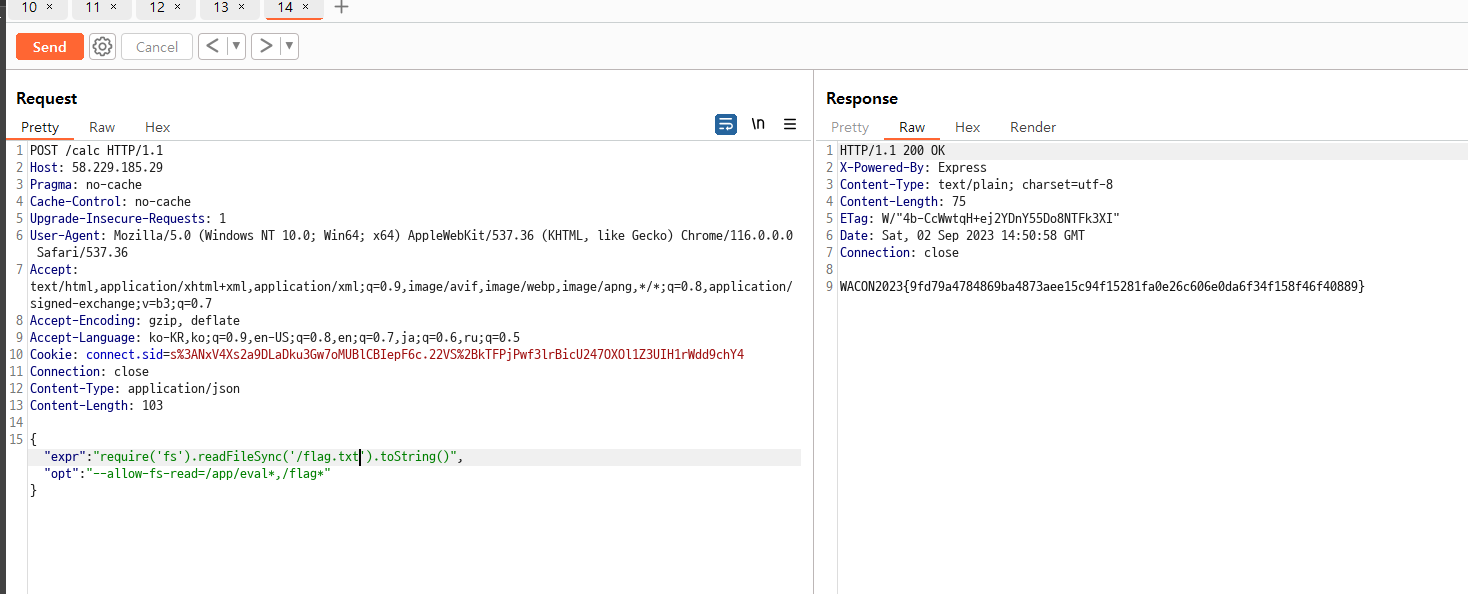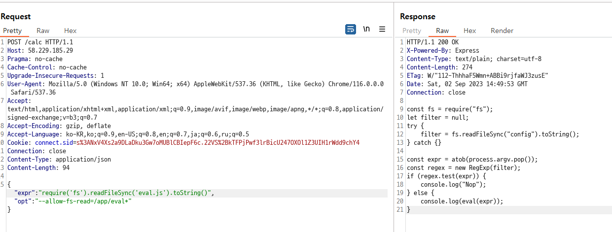 예를 들어, 다음과 같이 `--allow-fs-read=/app/eval*` 옵션을 전달하면 eval.js 파일에 대해서만 File Read가 가능합니다. 이때, eval.js 파일에서는 `config` 파일을 읽지 못해 사용자가 전달한 `expr` 파라미터를 검증할 수 없어 임의의 코드를 실행할 수 있습니다.