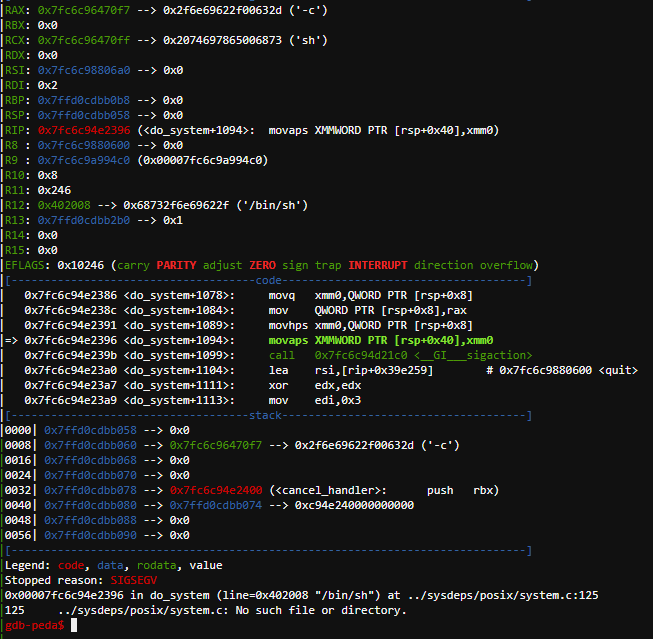 근데 `glibc 2.27` 버전에서 `do_system+1094` 부분에 에러가 발생한다.