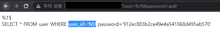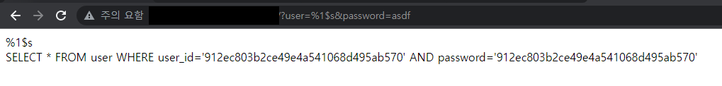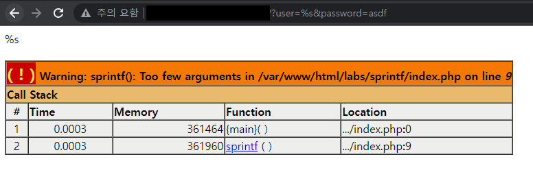 만약 공격자가 user 파라미터에 `%s` 라는 문자열을 전송할 경우 서버는 다음과 같이 에러를 출력한다.