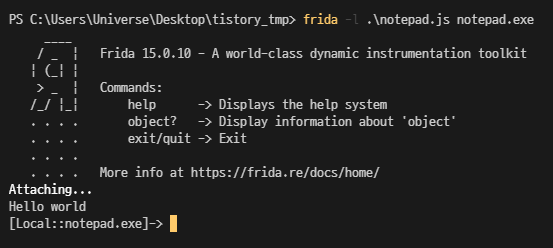 Frida 설치가 끝나면, Frida를 이용해서 Hello world를 출력해보자.