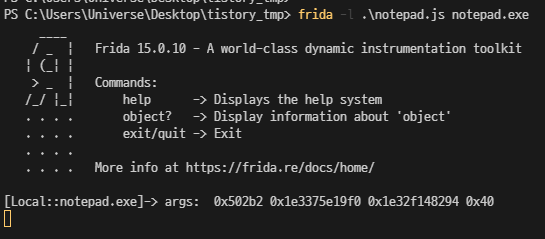 참고로 두번째, 세번째 인자는 문자열이 아닌 포인터를 넣어야 하므로 `Memory.allocUtf16String()` 함수를 써서 문자열을 저장하는 주소를 할당받아, 이를 인자로 넘겨 준다.