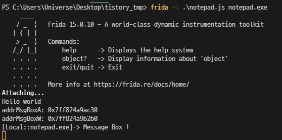 `MessageBoxW` 라는 API는 어떤 DLL 파일에서 호출되는지 모른다면, 2번째 줄 처럼 `Module.findExportByName` 함수를 통해 첫번째 인자에 `null`을 주면 알아서 해당 함수의 주소를 리턴해준다.