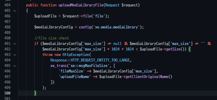 파일 업로드를 처리하는 파일은 `/core/src/Xpressengine/MediaLibrary/MediaLibraryHandler.php` 에서 `484번째` 줄에서 시작한다. 아래 코드는 파일 크기를 검증하고 있다.