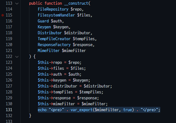 같은 파일에 `131번째` 줄에 아래 사진처럼 코드를 추가하여 `$mimeFilter` 변수에 어떠한 값이 들어가 있는지 확인해보았다.