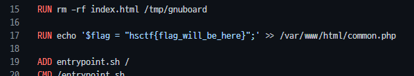 위 첨부파일에서 Dockerfile 파일을 보면, common.php 파일 안에 `$flag` 라는 변수가 저장된 것을 볼 수 있다.