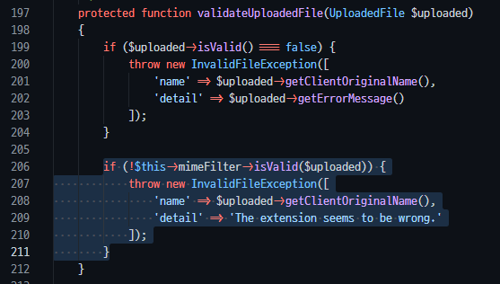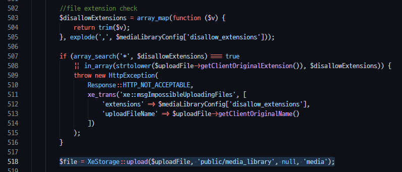 `502 ~ 516번째` 줄에서는 파일 확장자를 검사하는 로직인데 디버깅 해본 결과, php, phar 등을 넣어도 이 로직에서 걸리지 않는다. 확장자를 검증하는 곳은 `518번째` 줄이다.