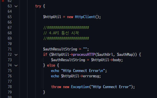 이후, `HttpClient` 객체를 이용하여 `72번째` 줄에 `$authUrl` 변수에 저장된 값으로 request를 보내게 된다. 만약 에러가 발생한다면, `78번째` 줄에서 except를 발생 시킨다.