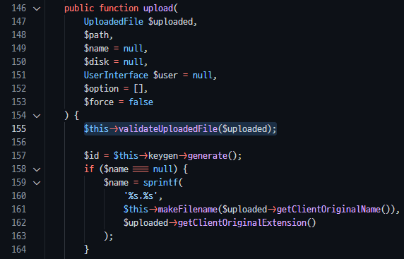 위 코드에서 `518번째` 줄에 `upload()` 함수를 호출하는데, 이 함수의 위치는 `/core/src/Xpressengine/Storage/Storage.php` 에서 `146 번째` 줄 이다. `155번째` 줄에서 `validateUploadedFile()` 함수를 호출한다.