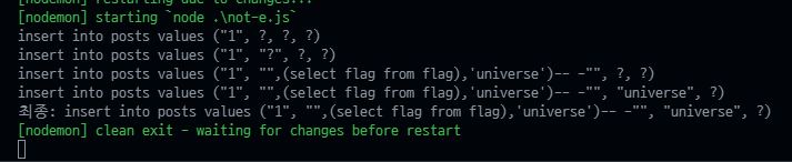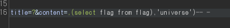최종적으로, content 변수에 `,(select flag from flag),'universe')-- -` 같은 값을 넣게 되면, sqli 가 가능하다는 것을 알 수 있다.
