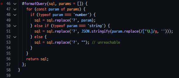 sql = sql.replace('?', JSON.stringify(param.replace(/["\\]/g, '')));