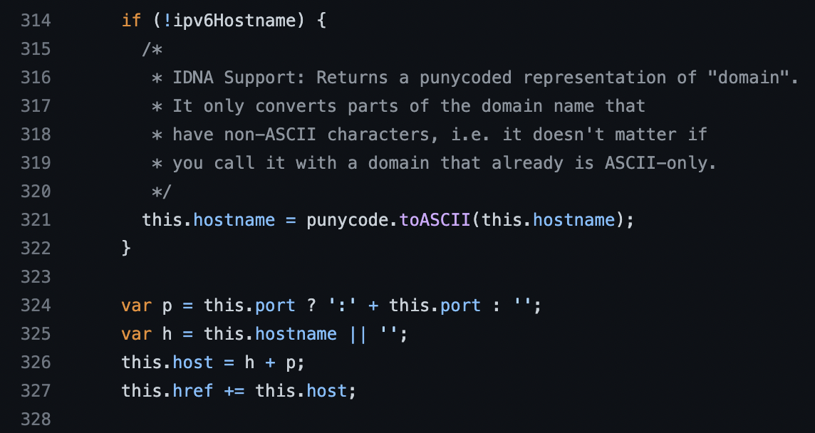 실제로 url.parse() 함수의 소스 코드를 보면 `punycode.toASCII()` 함수를 통해 non-ascii 문자를 ascii로 변환해주는 작업을 하고 있습니다. 이 host 값은 href 값에도 사용되고 있습니다.