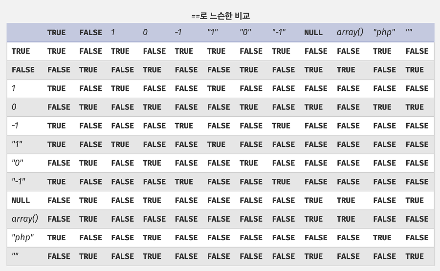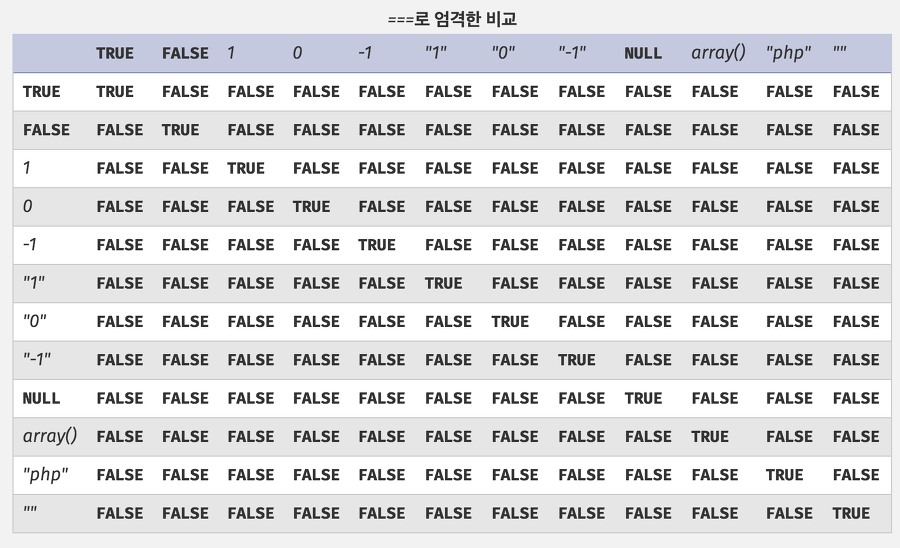 아래 표는 === 연산자를 사용하여 == 보다 엄격한 비교를 하는 것을 보여주는 표 이다.