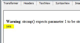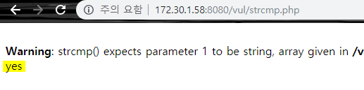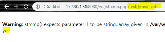 그런데 php warning 과 함께 yes 라는 값이 출력이 되었다.