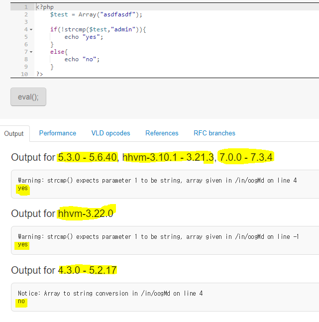 Enable javascript to submit You have javascript disabled. You will not be able to edit any code. Output for 5.3.0 - 5.6.40, hhvm-3.10.1 - 3.21.3, 7.0.0 - 7.3.4Warning: strcmp() expects parameter 1 to be string, array given in /in/oogMd on line 4 yesOutput
