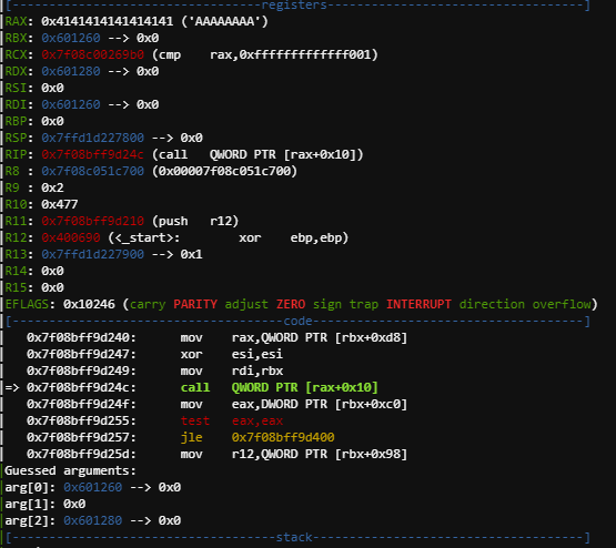 위 사진을 보면 `call QWORD PTR [rax + 0x10]` 에서 멈췄는데, `rax` 값 때문에 발생한 에러 입니다. 이때의 `rax` 값은 python 코드로 `fake _IO_FILE`을 만들때 `fake vtable` 값입니다. 이를 잘 조작하면 `call` 함수로 인해 원하는 곳으로 점프하게 됩니다.