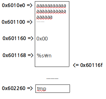 그렇게 된다면 0x601160 값은 0x00 이 되고 printf 과정에서 0x601160 => 0x601100 주소의 값을 출력하게 된다.