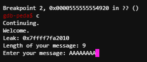 크기를 9로 하고, 입력값을 AAAAAAAA(8개)로 하여 값을 입력했다.