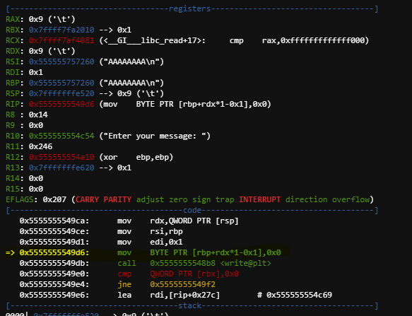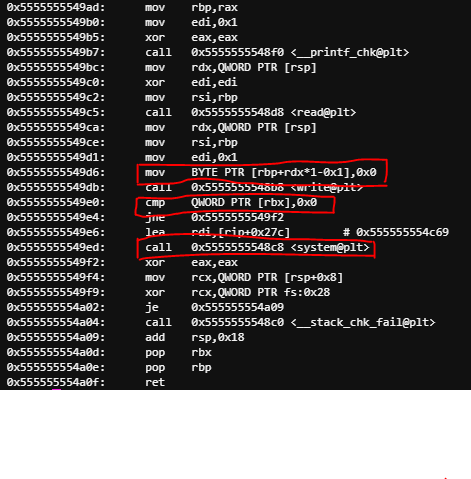 여기서 [rbp + rdx * 1 - 0x1] 에 저장된 주소를 참조하여 저장된 값을 0x0으로 바꾼다.