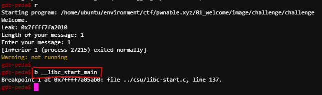 프로그램을 실행한 다음 b __libc_start_main에 breakpoint를 걸어준다.