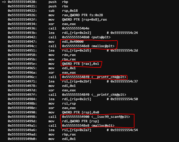 0x55555555494c: call 0x5555555548e8 <malloc@plt>