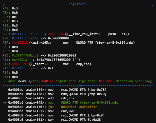 다시 돌아와서 c코드의 4번째 줄에서 어떤 주소의 값을 rdx 값으로 바꿀 수 있다.
