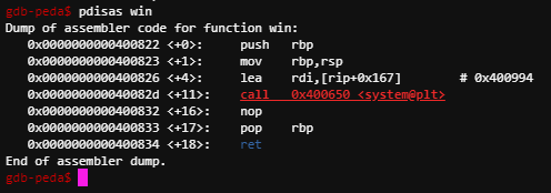 win 함수의 주소는 0x0000000000400822 이다. 이 함수는 system 함수를 실행하는 함수이다.