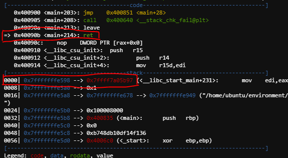 return address는 0x7fffffffe598 임을 알 수 있다.