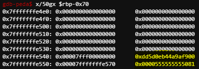 아래 사진은 main 함수의 스택이다. 첫번째 노란색은 canary 값, 두번째 노란색은 RET 값이다.