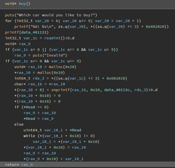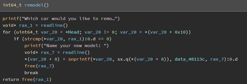 `remodel()` 함수를 보면 사용자가 구매한 자동차의 이름을 변경할 수 있는데, snprintf() 함수로 이름을 변경하고 이때의 return 값을 `car` 구조체의 `car+8`에 저장한다.
