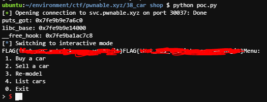 - 자동차 이름의 크기는 0x40으로 바뀌었으므로 다시 `remodel()` 함수를 호출해서 `"A"*0x20 + p64(e.got["puts"])` 로 overwrite 한다.