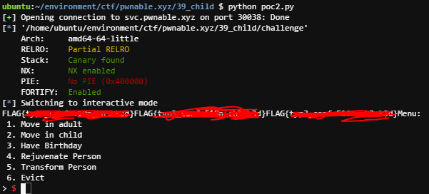 이후 맨 처음에 만들어 둔 `adult` 구조체를 `transform_person()` 로 호출하여 `free()` GOT를 `win()` 함수의 주소로 Overwrite 한다.